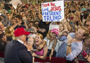 Trump kandi yanagaragaye mu bikorwa bifite isura y’iyobokamana, nko gufata Bibiliya imbere y’itorero rya St. John’s Episcopal Church i Washington D.C. mu 2020 mu gihe cy’imyigaragambyo, igikorwa cyafashwe nk’ikimenyetso cyo gukoresha imyemerere mu rwego rwa politiki. Nubwo yivugira ko ari umukristo, ubushakashatsi bwerekanye ko benshi mu banyamerika batamubonaga nk’umuntu w’iyobokamana, ahubwo bamufataga nk’ukoresha imyemerere mu rwego rwa politiki kurusha mu buzima bwa buri munsi.