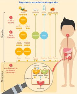 Mu gifu no mu mara, enzymes (amylase, maltase, lactase) zifasha mu ihindura rya za polysaccharides na disaccharides mo monosaccharides (glucose, fructose, galactose). Ibi bituma isukari iba mu buryo bworoshye bwo kwinjizwa mu mu maraso.